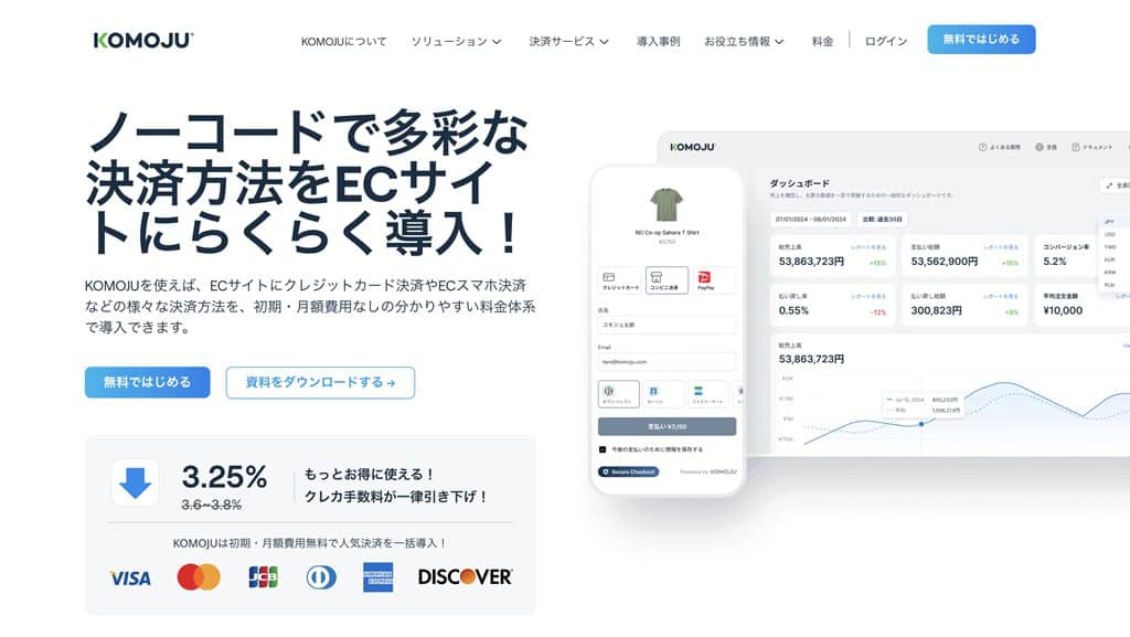 KOMOJUは初期費用・月額費用ともに無料で、決済ごとの手数料のみが発生します。追加開発や外部ツールとの複雑な連携も不要なため、WooCommerceに多様な決済方法を低コストで導入できます。