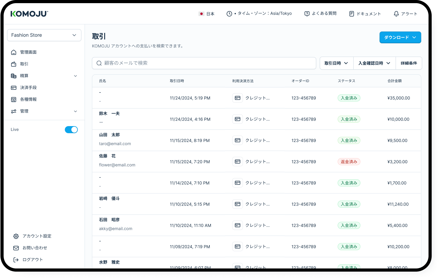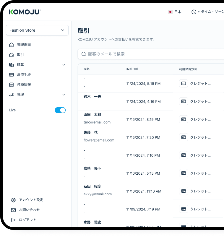 審査が完了後にKOMOJU管理画面に表示されるログイン情報でアプリにログインしていただき、ご利用開始いただけます。