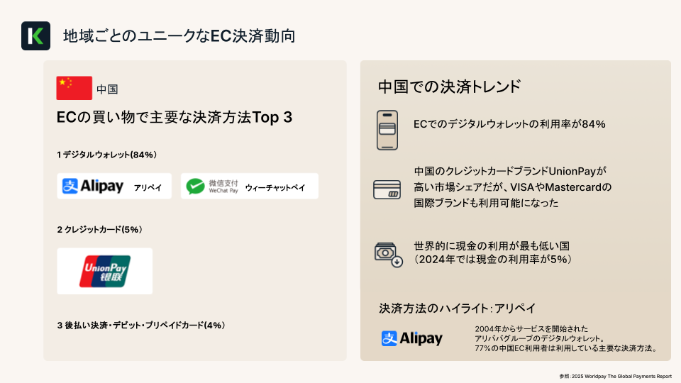 一方、中国では AlipayとWeChat Payが約8割以上のシェアを占め、世界的にデジタルウォレットの利用が拡大していることが明らかになりました。